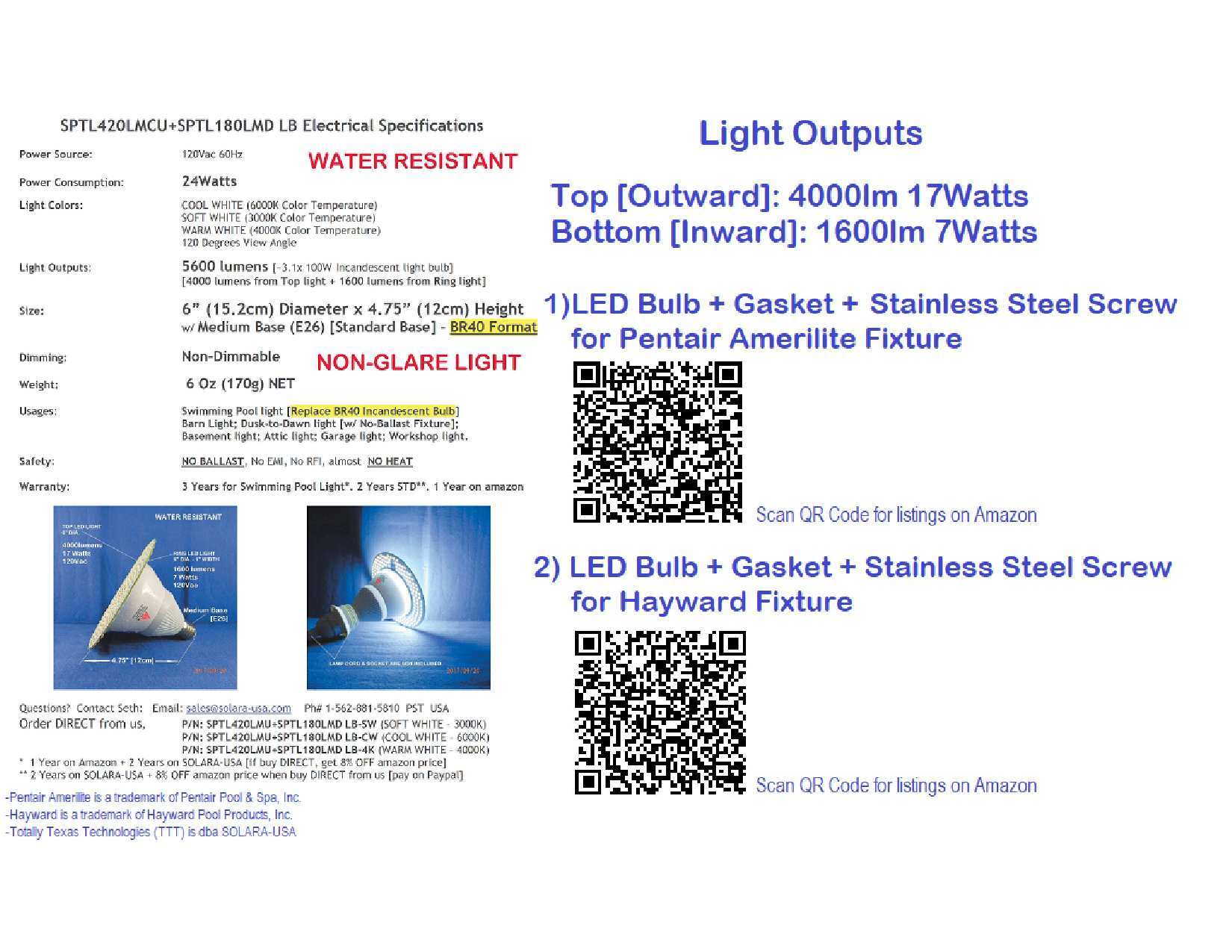 5600lm LED Bulb Replacement for BR40 Incandescent Bulb Pool Light for Hayward, Pentair Fixtures, P/N: SPTL420LMU+SPTL180LMD-LB-COLOR