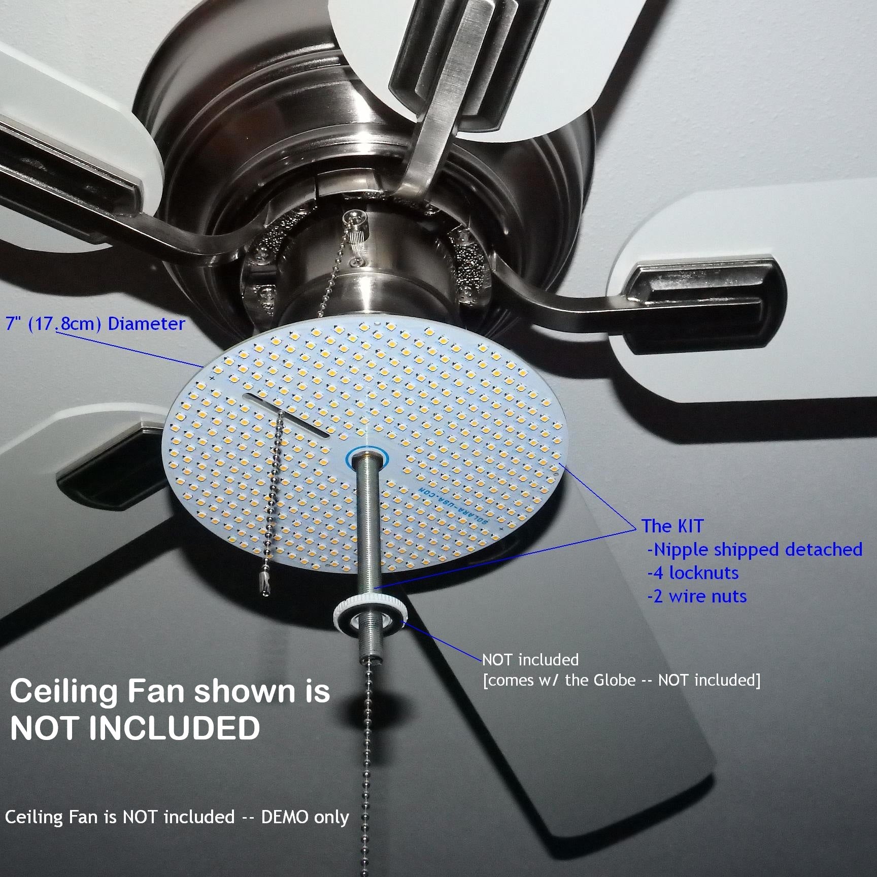 Our SUPER BRIGHT 7" LED Disc Custom-Designed (with Slot) For Ceiling Fan with Pull-Chain Switch, Nipple-Mounting (6" Threaded Nipple + 4 Hex Nuts INCLUDED)