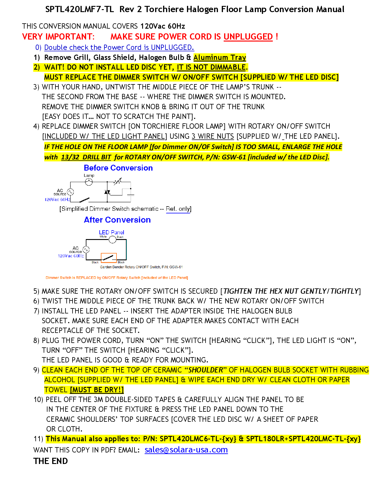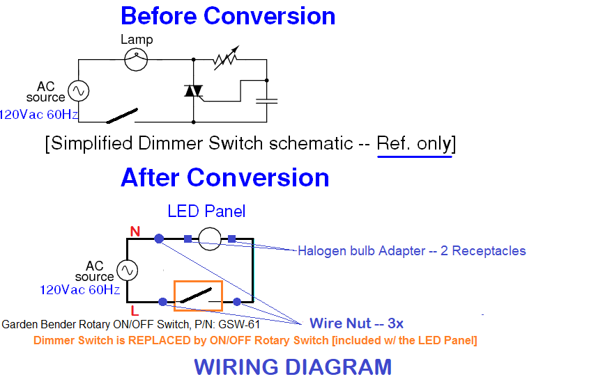 -This LED Disc is NOT DIMMABLE. Dimmer Switch on the lamp MUST BE Replaced with ON/OFF Rotary Switch Included with the LED Disc (See Wiring Diagram).